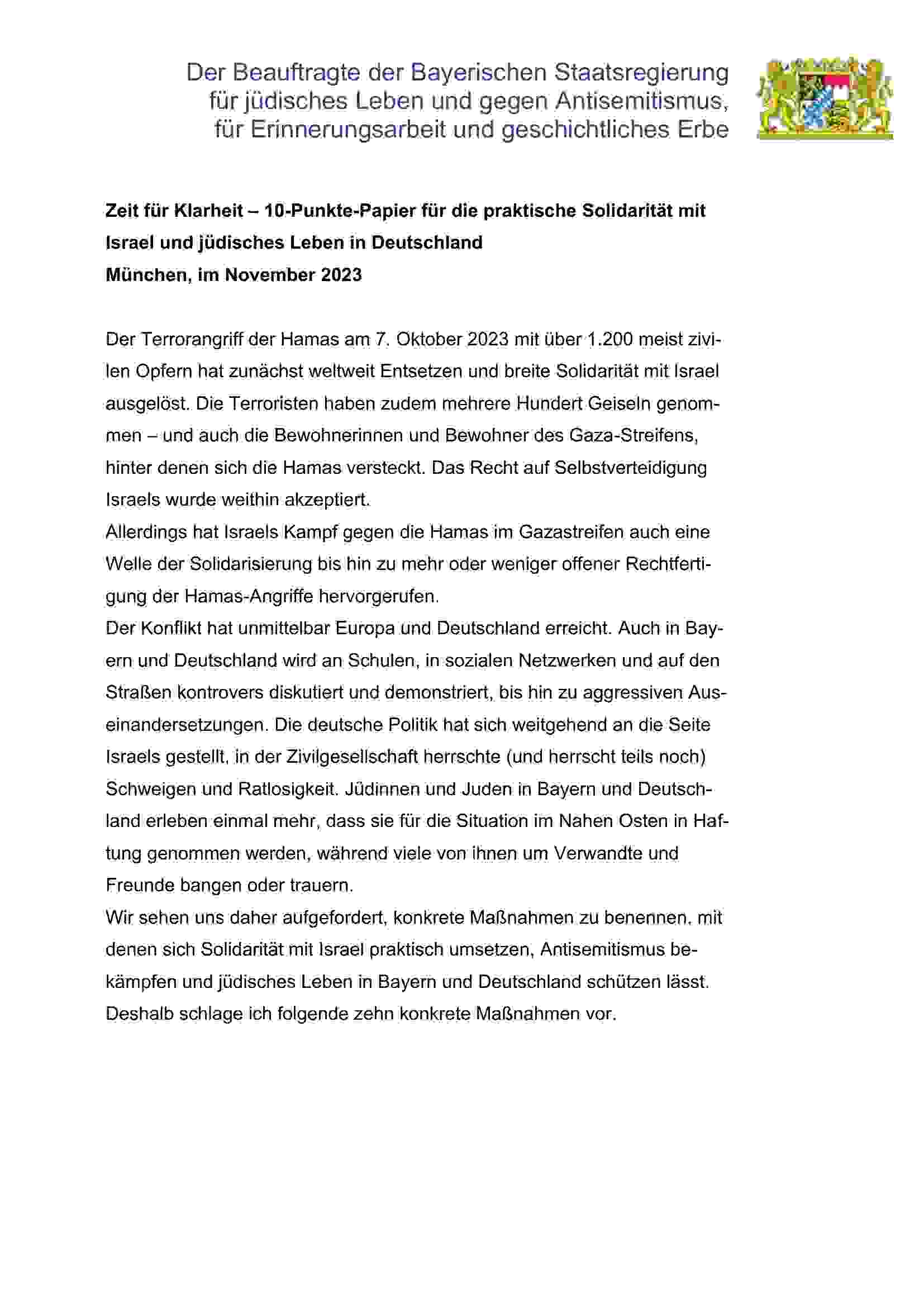 10-Punkte-Papier für die praktische Solidarität mit Israel und jüdisches Leben in Deutschland Das Dokument analysiert die aktuelle Lage jüdischen Lebens in Bayern und beschreibt die daraus resultierenden Aufgaben für Staat und Gesellschaft. Im Fokus stehen die Dokumentation antisemitischer Vorfälle, die Weiterentwicklung präventiver Bildungsangebote sowie die Vernetzung zivilgesellschaftlicher Akteure. Es legt die fachlichen Grundlagen für eine koordinierte Strategie dar, um Judenhass strukturell zu begegnen und die Sicherheit jüdischer Gemeinden zu erhöhen.